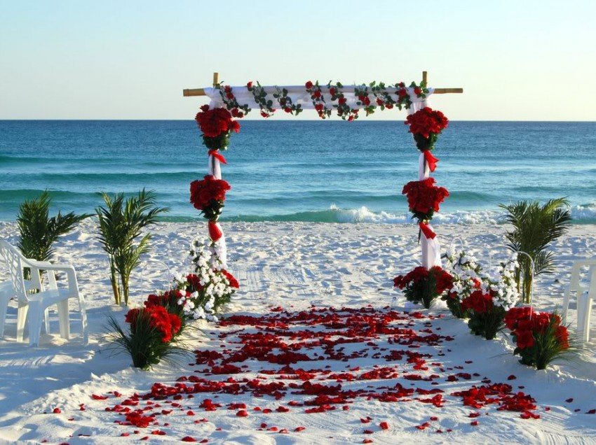 Если бракосочетание будет выездным, тогда нужно позаботиться об арке. Её можно сделать из дерева, из металлических или труб ПВХ. Такая арка украшается цветами. Здесь ставится небольшой высокий столик, на котором молодые будут подписывать брачное соглашение, тут находятся и кольца.